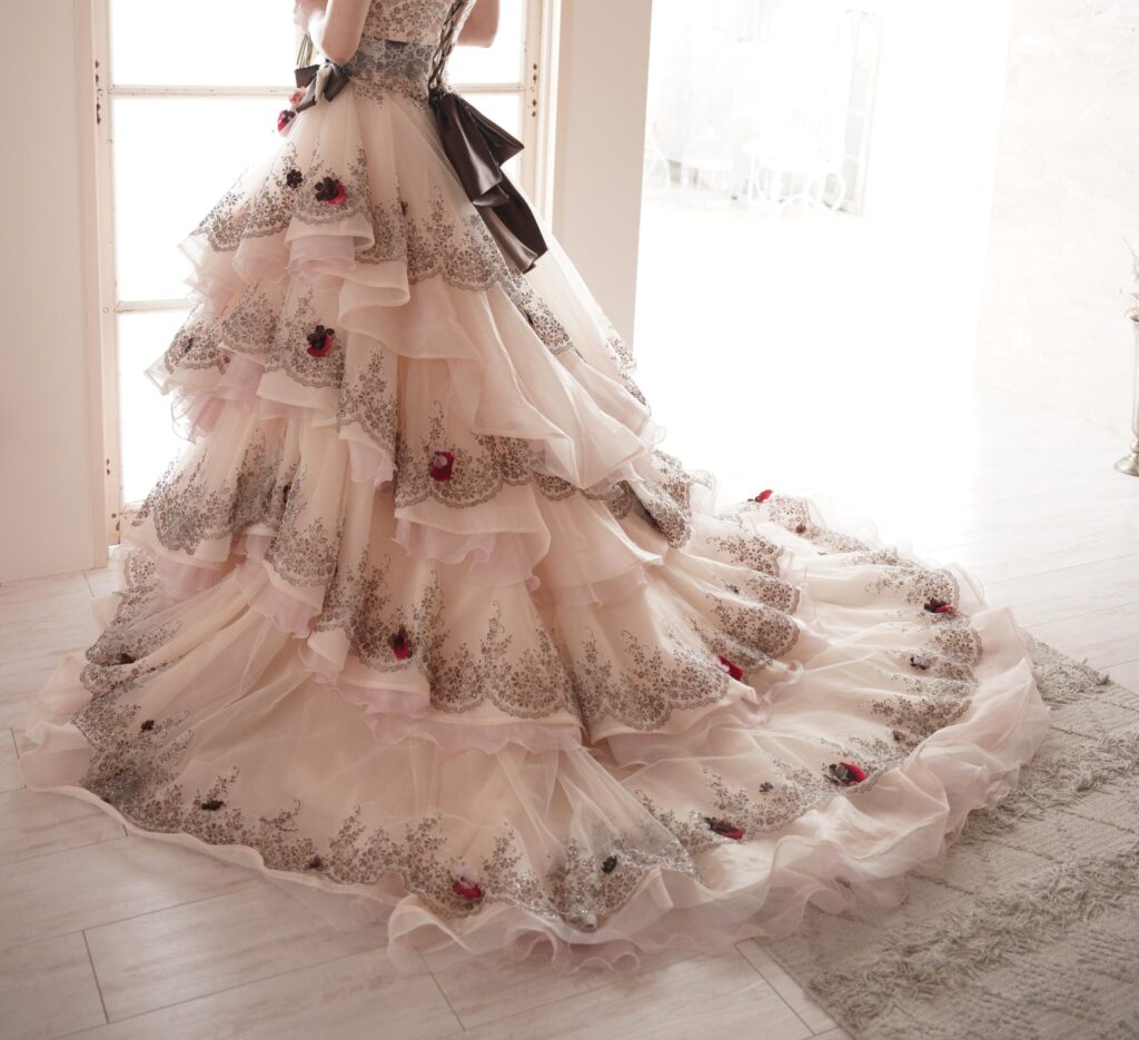 …でも、実物はキラキラしているのに、写真で見ると案外キラキラが写ってなくて、普通の薄ピンクのドレスなんだよなぁ…。